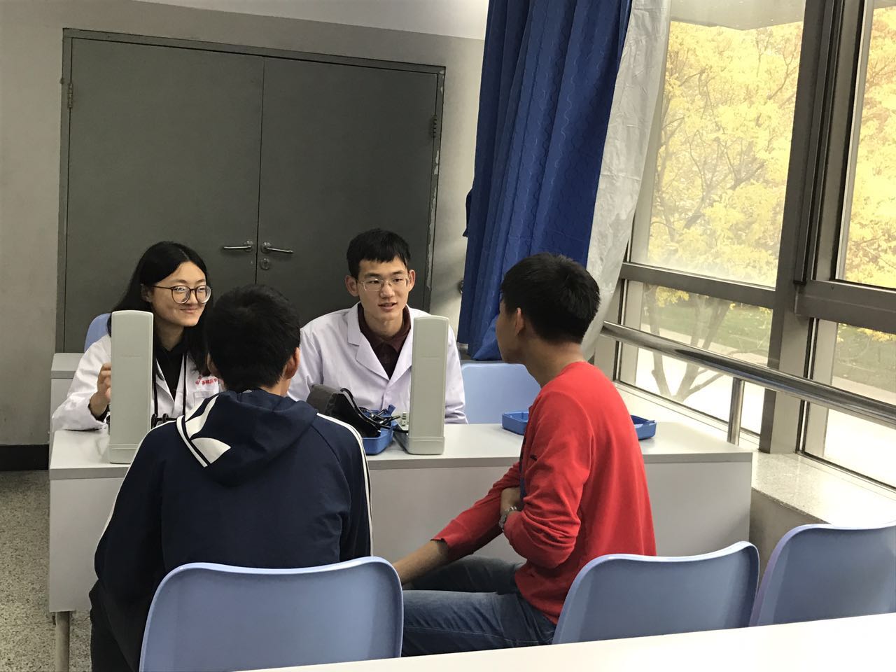 上午十点,中医药的小伙伴们到达了北体,开始了义诊。义诊项目多样,有量血压,耳针,手诊和推拿。不断有北体的同学前来体验义诊。中医药的志愿者们在对多位同学诊断后,建议大家规律作息时间,多进行体育锻炼,杜绝潜在的健康隐患。