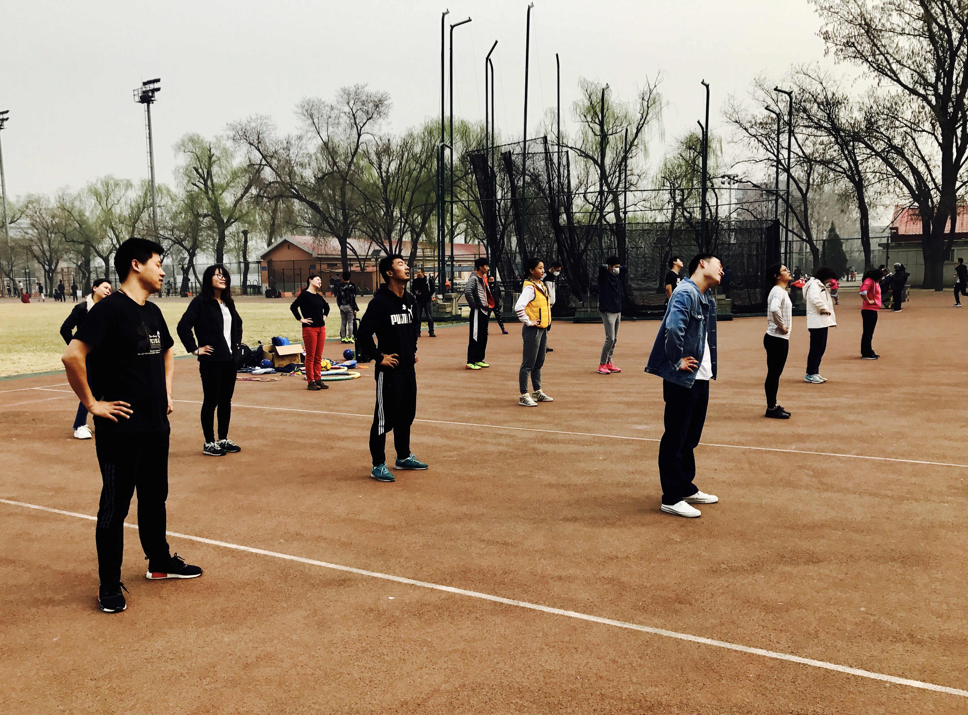 九点半,小部员们来到了操场,有些开始热身以吸引周围的人前来一起运动,有些则上前号召大家一起参与。伴随着大家的热情,越来越多的人加入了我们的队伍。