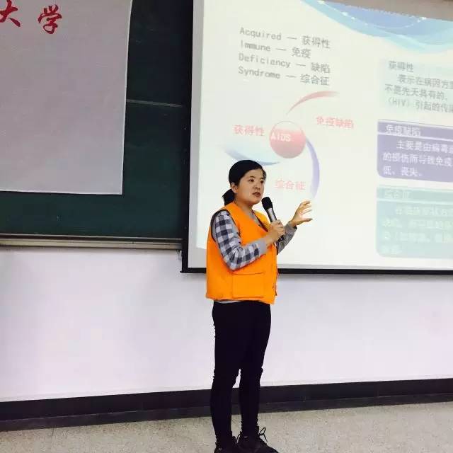 北京市地坛医院的老师一到,就给大家带来了印有防艾知识的红丝带高校行宣传徽章,同学们都兴致勃勃的互相交换着看徽章上关于艾滋病传染知识。首先由戚老师为我们带来AIDS讲解,从名词AIDS,HIV含义,到艾滋病的感染的阶段,到感染途径,到预防,老师以详细有趣的PPT和生动活泼的言语为同学们介绍了基础的艾滋病知识,当中与同学们的互动更是让人忍俊不禁。