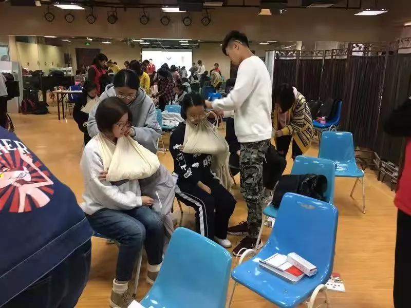 主讲老师首先给同学们介绍了创伤救护的理论知识和注意事项,之后进行了多种包扎方法的操作演示,使同学们在学习理论知识的基础上能够进行实际操作。