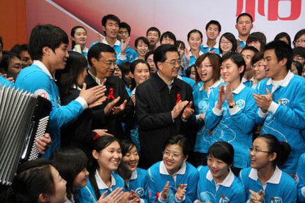 自成立以来,我校红十字会的活动不仅受到了的学校领导的大力支持,也受到了中央领导人的肯定。2009年11月30日,我校红十字学生分会会长俞奇彬等其他同学,作为首都防治艾滋病志愿者的代表,在国家会议中心受到了胡锦涛总书记和国务院副总理李克强的亲切问候。胡锦涛总书记与我校红十字会成员一道制作红丝带,观看了他们表演的手语歌曲《微笑北京》,最后总书记还与大家一同唱起《让世界充满爱》,将活动推向了高潮。此次我校防艾志愿者能作为高校代表参与“首都防治艾滋病志愿者活动”并受到国家领导人的接见与问候,是对我校志愿者工作的充分肯定,更是赋予了我们更大的责任和使命。