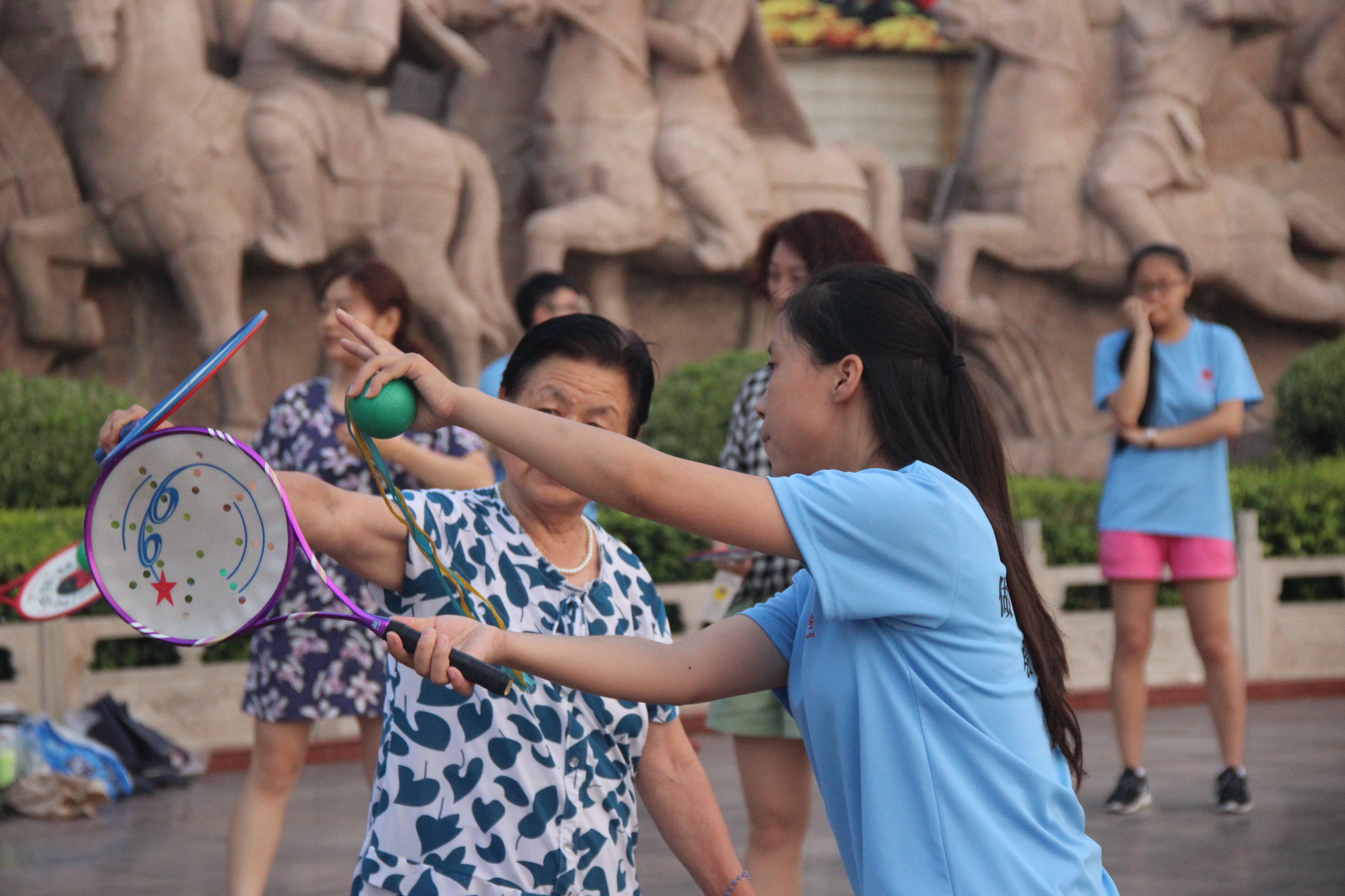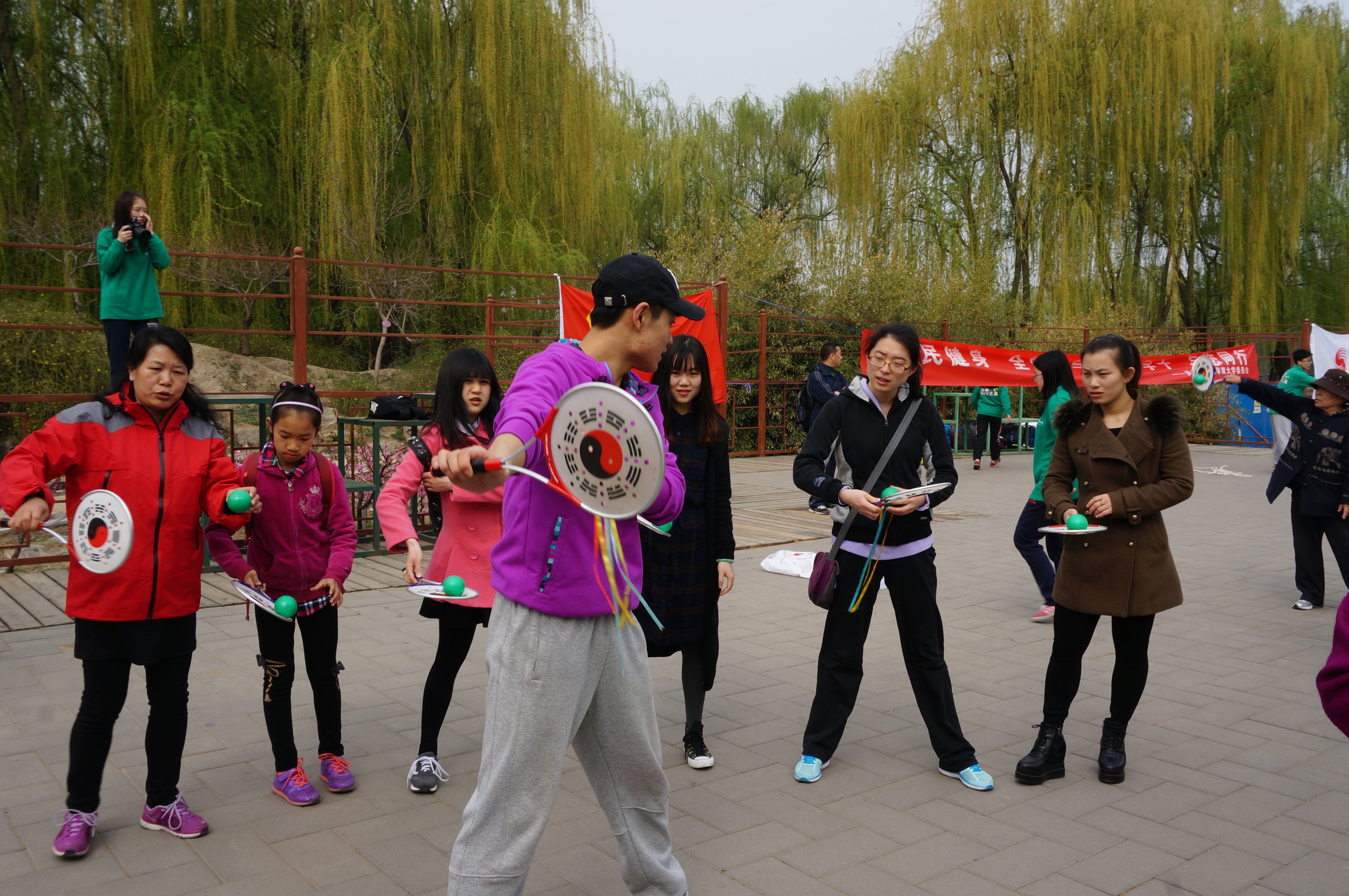 志愿者在圆明园开展全民健身之教授柔力球