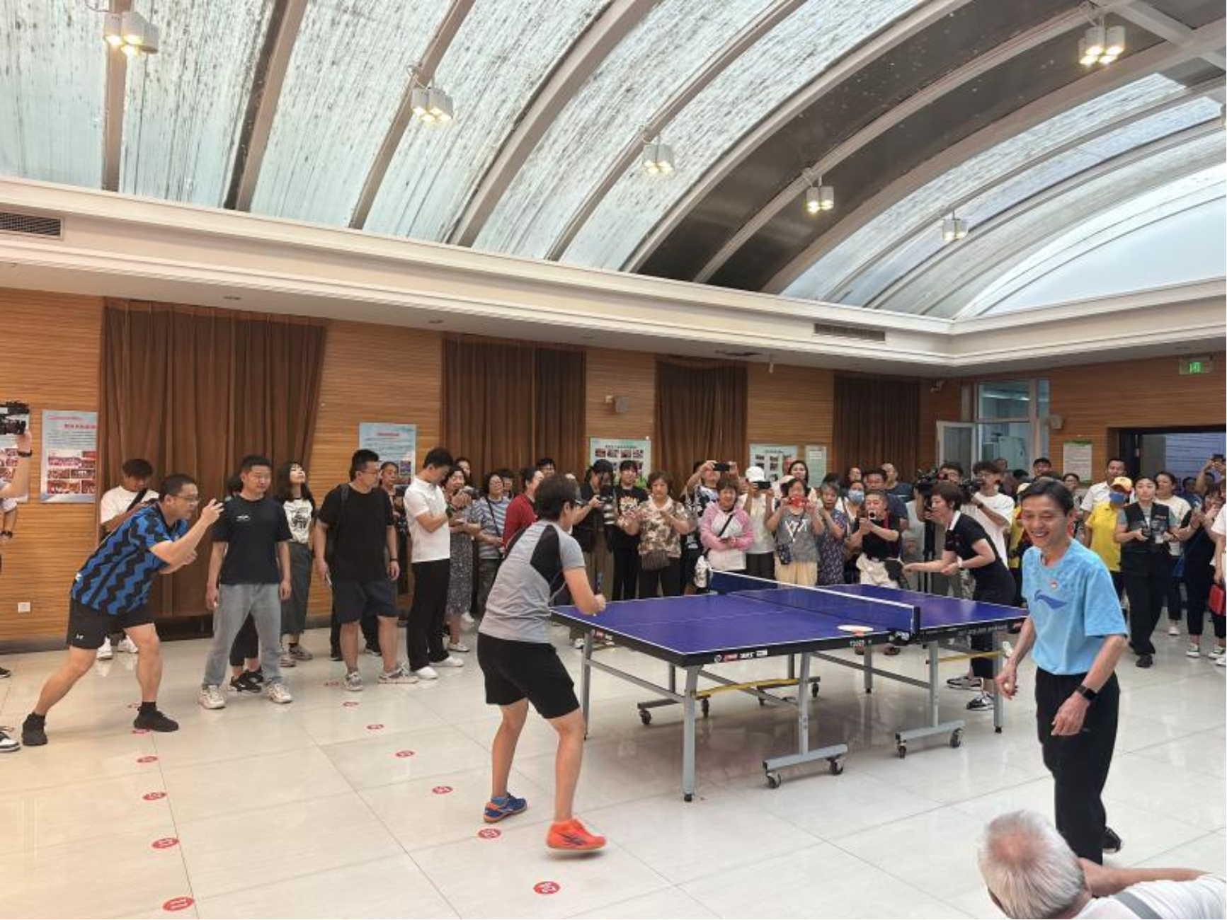 启动仪式现场,我校乒乓球教研室教师、乒乓球世界冠军牛剑锋副教授与体育馆路地区乒乓球爱好者进行了友谊赛,现场气氛热烈,许多居民跃跃欲试要与冠军切磋球技,叫好声此起彼伏。