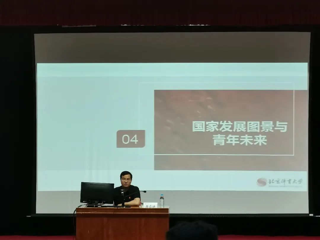 他结合党的二十大精神,从新时代新征程的历史方位、新时代新征程党的使命任务、中国式现代化的特征和本质要求、国家发展图景与青年未来和个人奋斗融入民族伟大复兴五个方面做了讲解,结合习近平总书记的青年观和体育强国建设目标对北体学子寄语希望要提高思想认识,深化理论学习,加强实践锻炼。将个人融入民族伟大复兴,激发青春动力、展现青春活力、扩大青春影响力、汇聚青春合力。