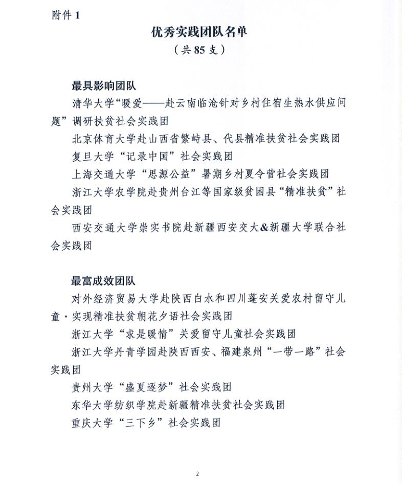 2016年全国大中专学生志愿者暑期“三下乡”社会实践活动的总体框架下,由团中央学校部指导,“一带一路”中国大学生公益联盟和浙江大学共同组织开展了“青春公益·美丽中国”大学生暑期专项社会实践活动。我校按照国家体育总局“突出体育扶贫 扶出体育特色”的工作方针,60余名师生深入山西繁峙县、代县开展体育艺术下基层、体育师资培训、全民健身指导、精准扶贫对象慰问等一系列体育扶贫帮扶活动,为两县全民健身事业做出了积极的贡献,当地10家媒体对开展的活动进行深入报道,实践活动受到两县干部群众的广泛赞誉,在两县产生了深远的影响。在此次活动总结及遴选中,我校山西省繁峙县、代县精准扶贫实践团荣获优秀实践团队“最具影响力团队”荣誉称号。
