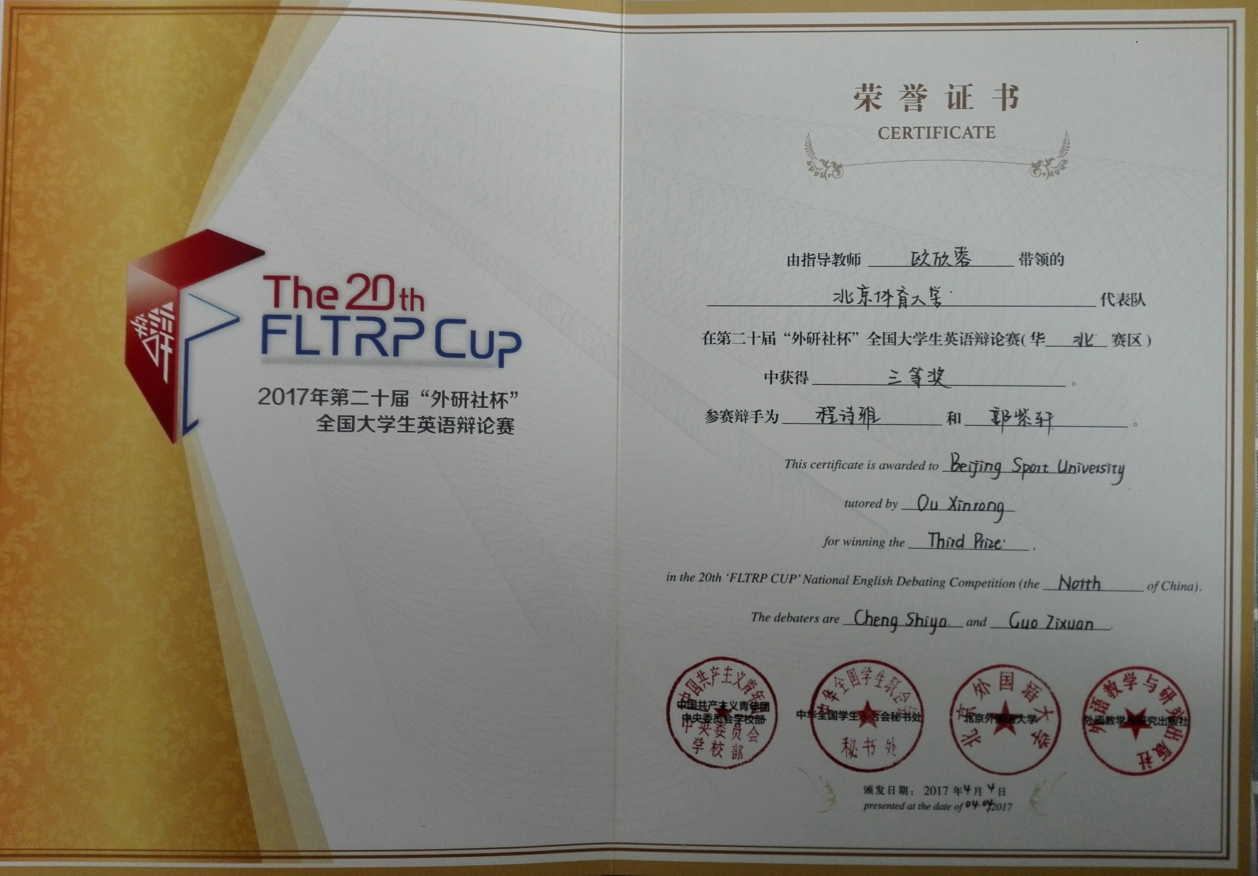 2017年4月4日,由共青团中央学校部、全国学联秘书处主办,外语教学与研究出版社承办2017年第二十届“外研社杯”全国大学生英语辩论赛华北赛区决赛在中央财经大学落下帷幕,由我校外语系学生郭紫轩、管理学院学生程诗雅组成的辩论队在外语系欧欣蓉老师带领下,以优异的成绩荣获华北赛区“三等奖”。