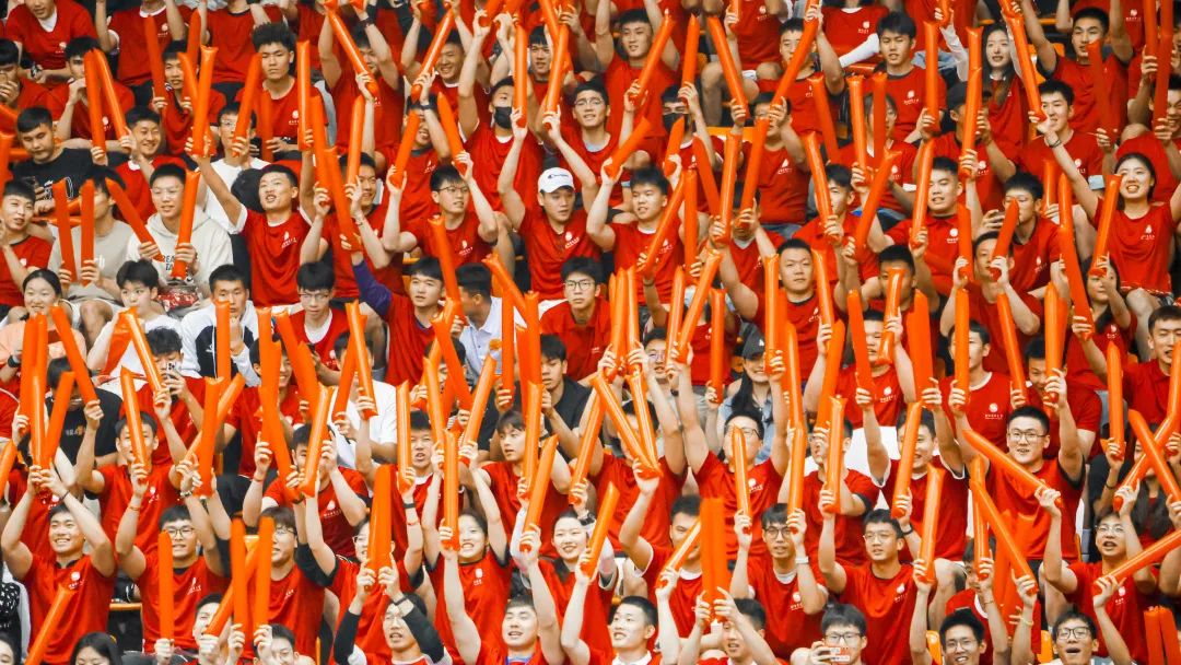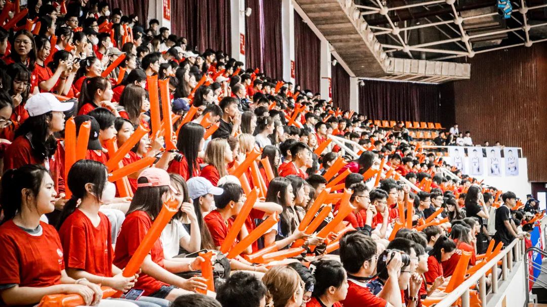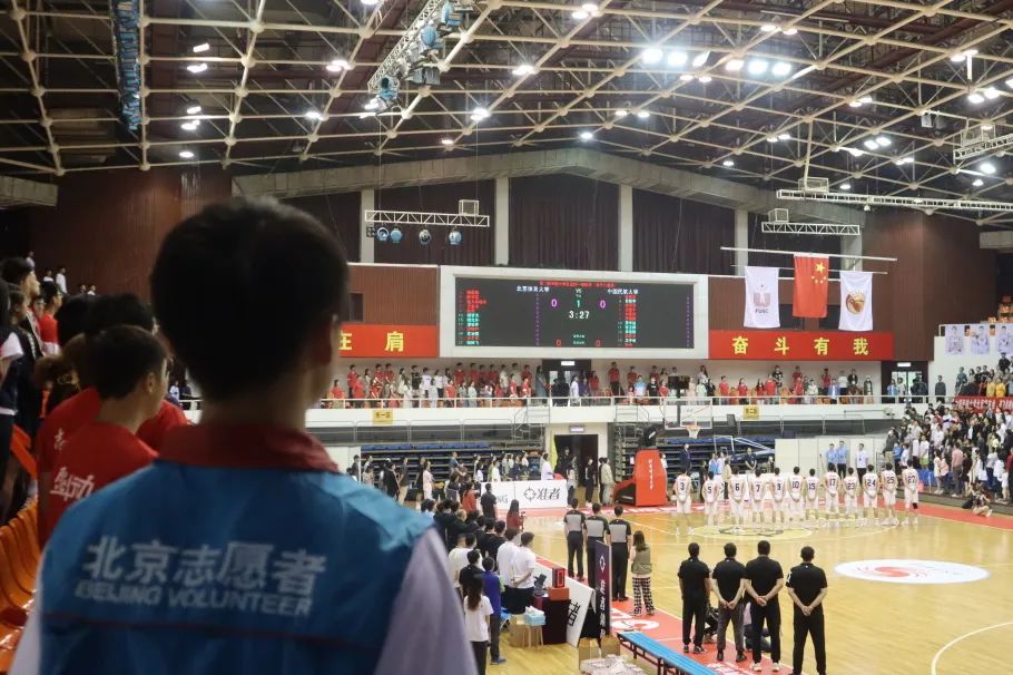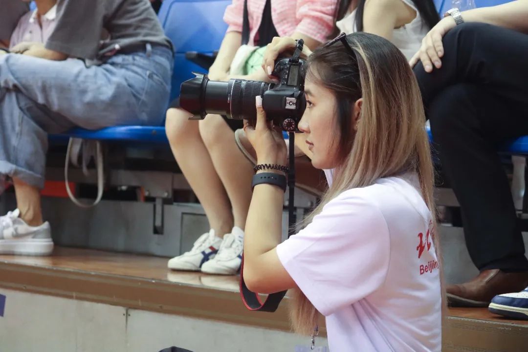球员出场时,观众大声为球员们呐喊助威,加油打气!伴随着激烈的比赛过程,观众们跟着主持人的节奏,喊出“XXXX-鹏程万里-XXXX-荣耀北体”的口号,将力量传递到球员身上,也将现场氛围烘托到了极点。一声声充满力量的呐喊,包含着观众们对赛事的热情;一次次发自内心的鼓励,承载着观众们对球员的支持。