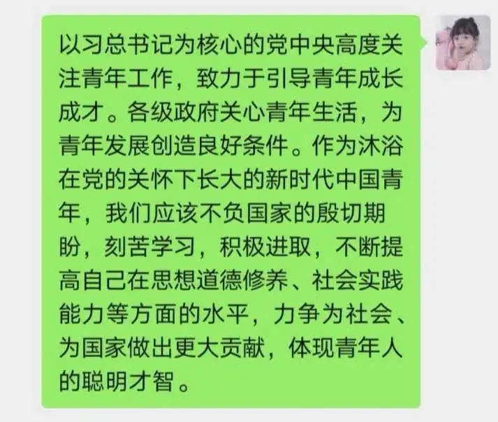 青年一代的我们,在新时代的浪潮中不断向前。青年一代的我们,是国家未来的建设者。让我们牢牢记住习近平总书记的贺信精神,坚定理想信念,培育高尚品格,练就过硬本领,勇于创新创造,矢志艰苦奋斗,同亿万人民一道,在矢志奋斗中谱写新时代的青春之歌。做敢于担当的奋进者、开拓者、奉献者,为党和国家事业发展作出新的更大的贡献!