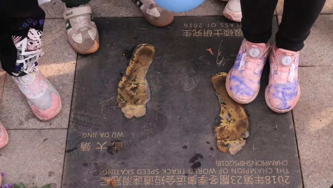 经过游泳馆后,同学和家长们来到了冠军之路,这里的每一个冠军的脚印都承载着汗水与泪水,承载着奥运精神、体育精神。志愿者带领同学和家长们漫步在冠军之路,为他们进行讲述奥运冠军的故事。