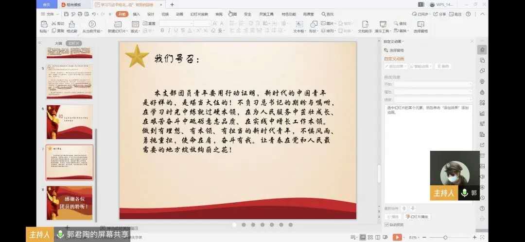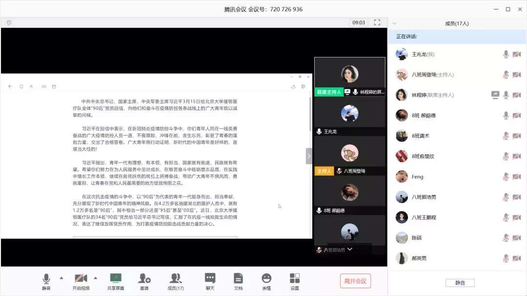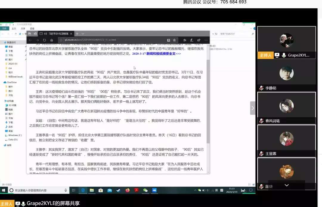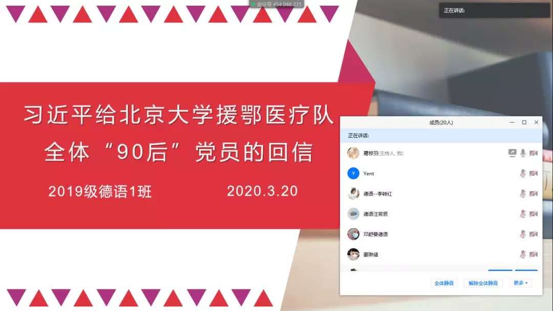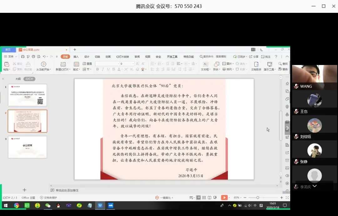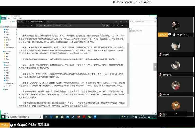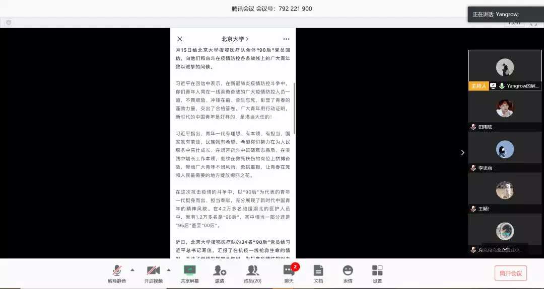 人文学院各团支部通过腾讯会议学习习近平总书记给北京大学援鄂医疗队全体“90 后”党员回信主题团日活动。