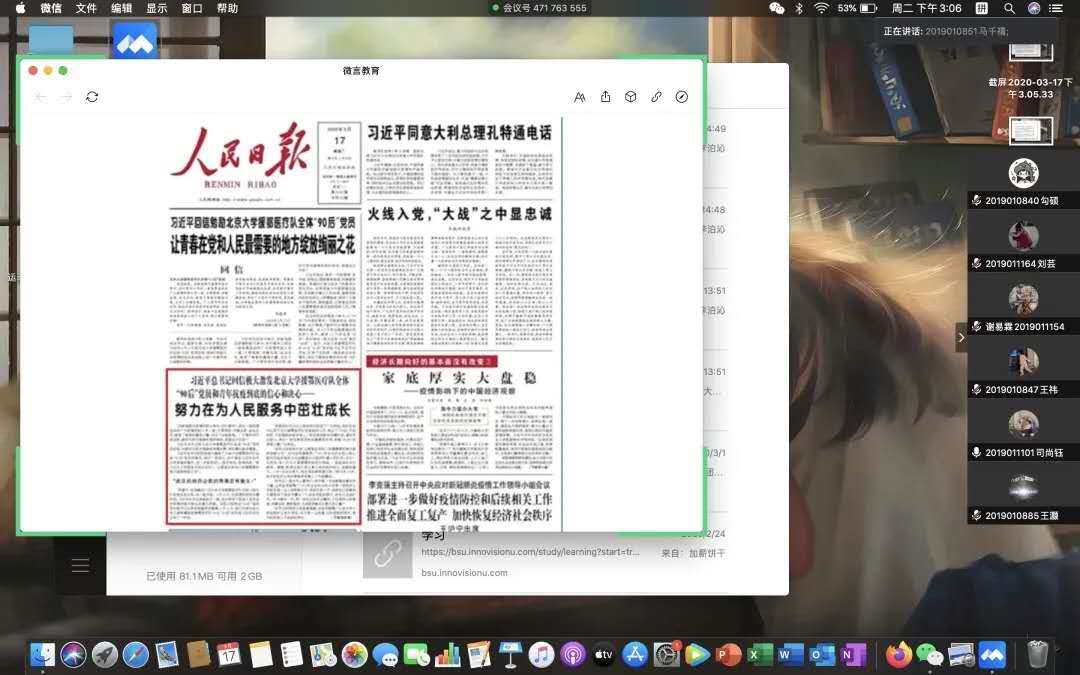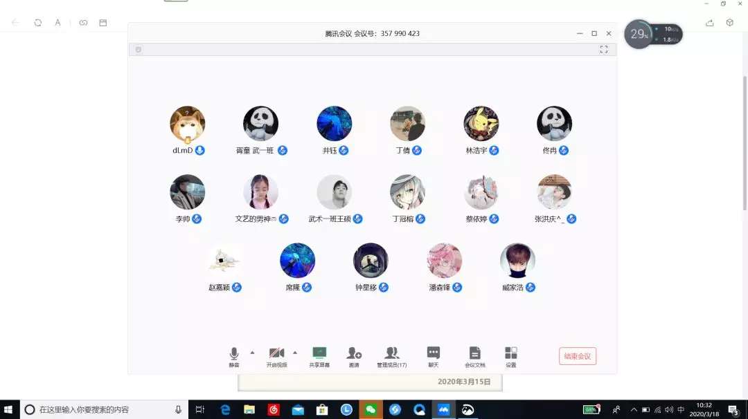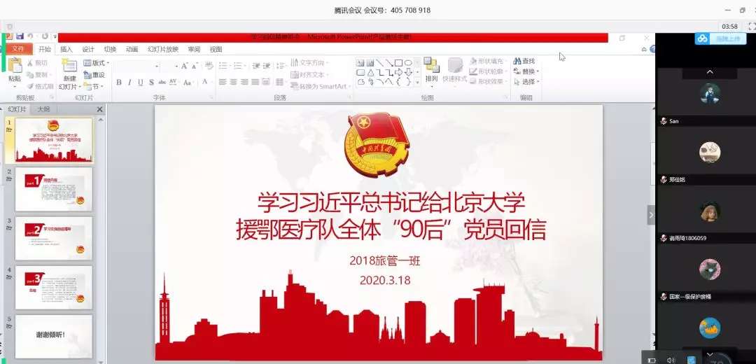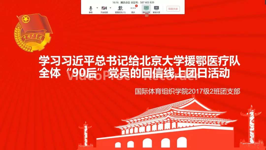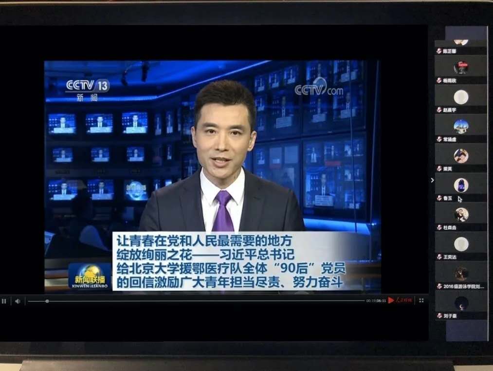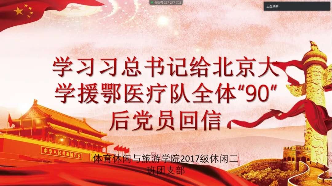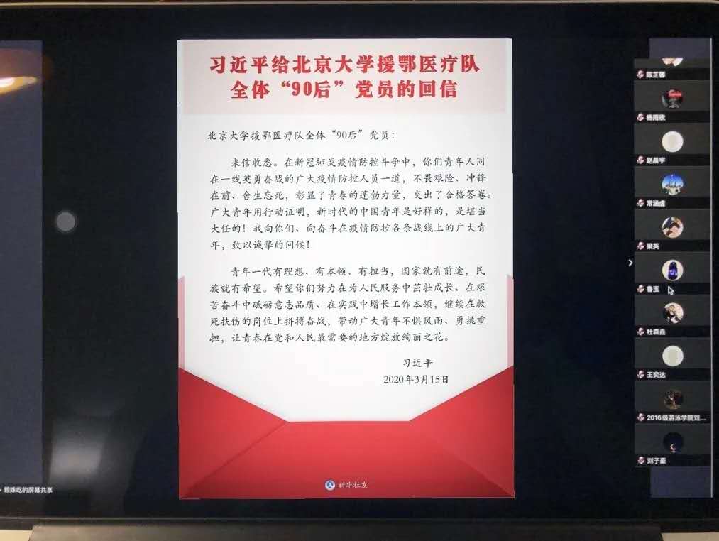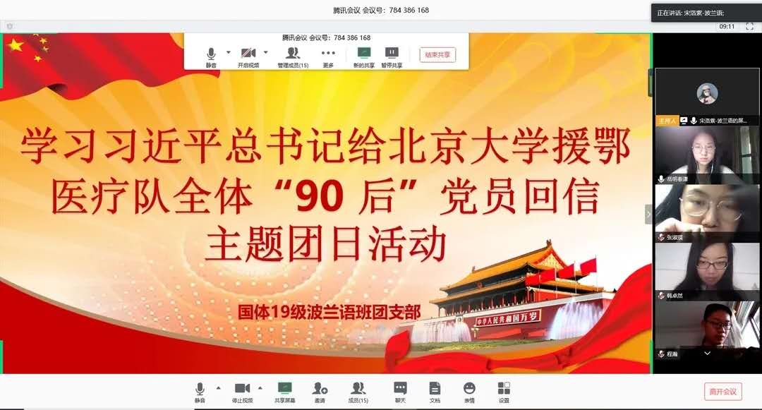 国际体育组织学院各团支部通过腾讯会议学习习近平总书记给北京大学援鄂医疗队全体“90 后”党员回信主题团日活动。