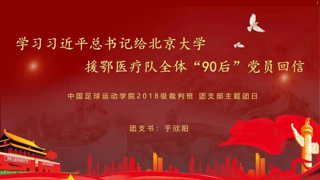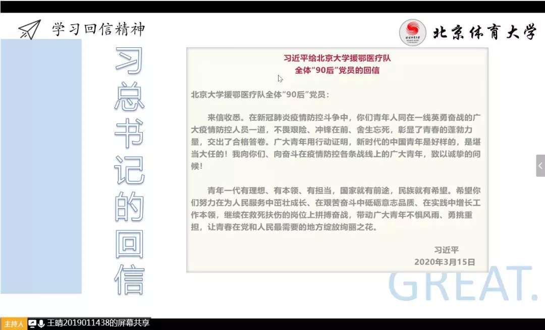 中国排球运动学院各团支部在线上开展学习习近平总书记给北京大学援鄂医疗队全体“90 后”党员回信主题团日活动。在活动结束后,同学们表示收获颇丰,并写下自己的感想。