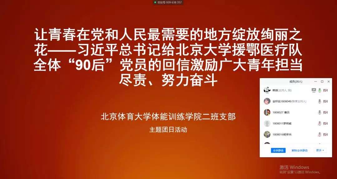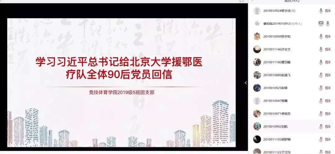 竞技体育学院各团支部通过腾讯会议学习习近平总书记给北京大学援鄂医疗队全体“90 后”党员回信主题团日活动。