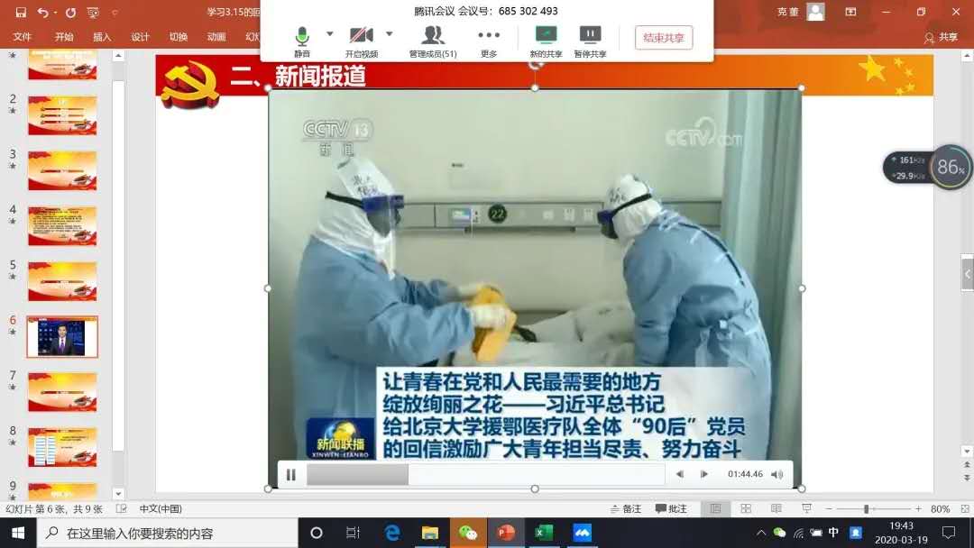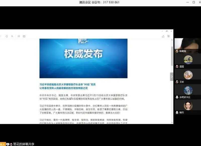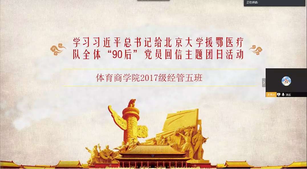 中国篮球运动学院各团支部通过腾讯会议学习习近平总书记给北京大学援鄂医疗队全体“90 后”党员回信主题团日活动。