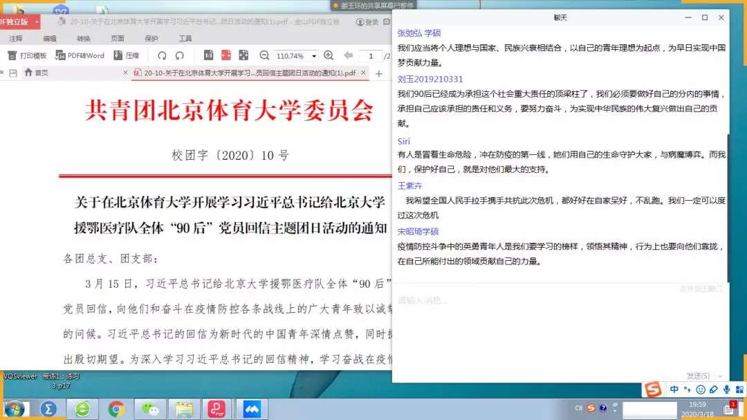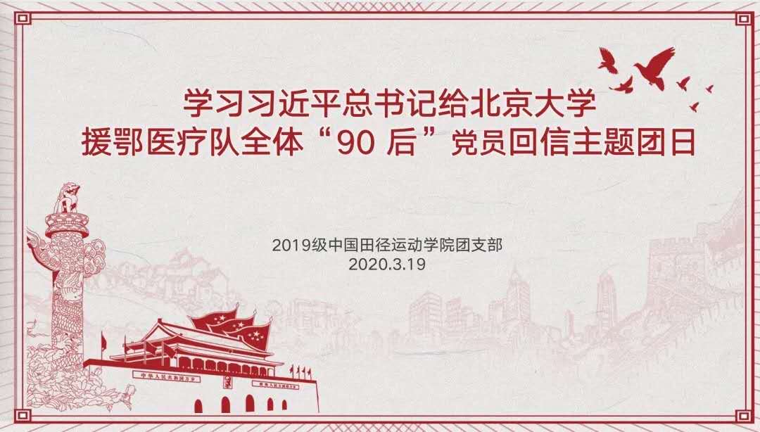 中国田径运动学院各团支部在线上开展学习习近平总书记给北京大学援鄂医疗队全体“90 后”党员回信主题团日活动。同学们积极发言,浅谈自己的心得体会。