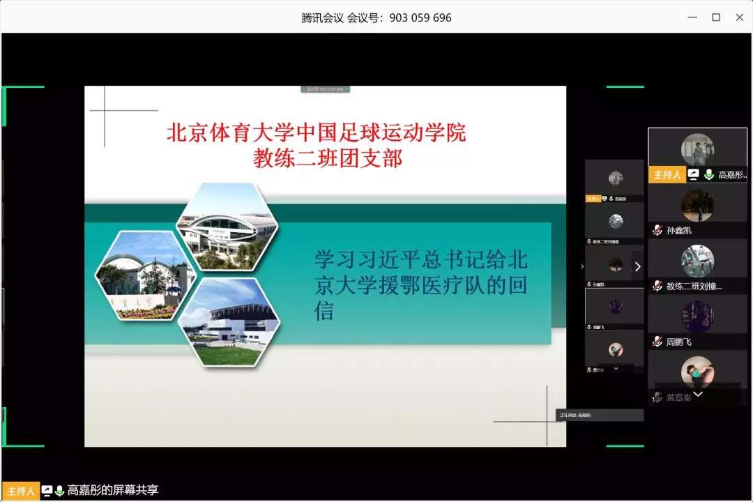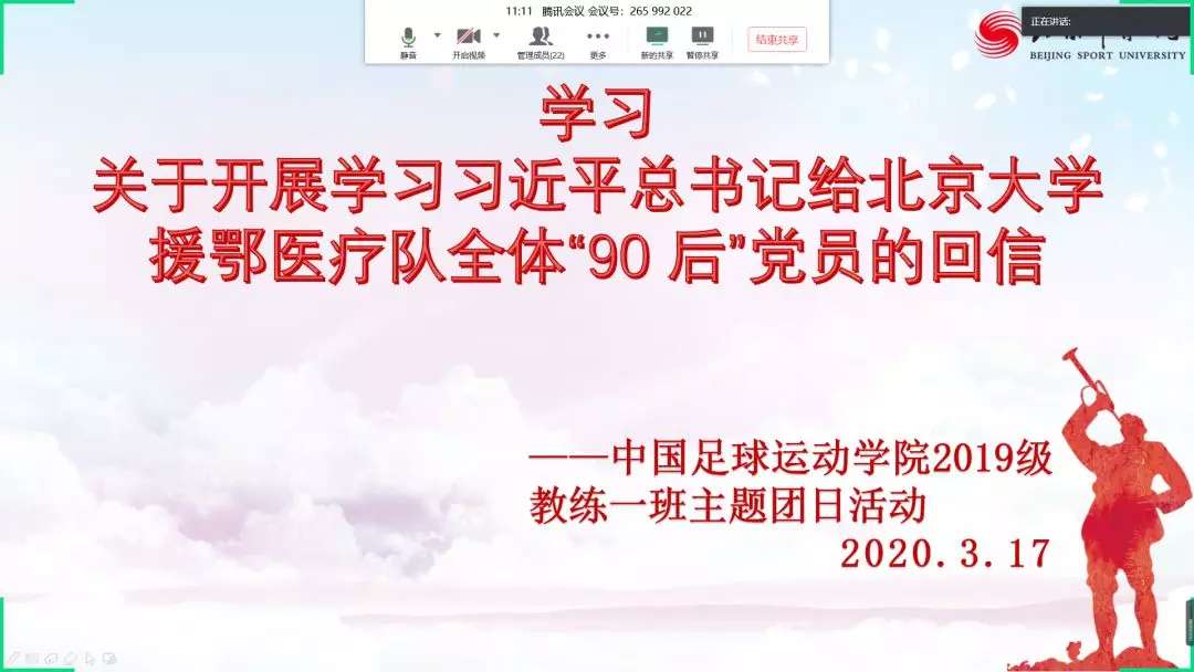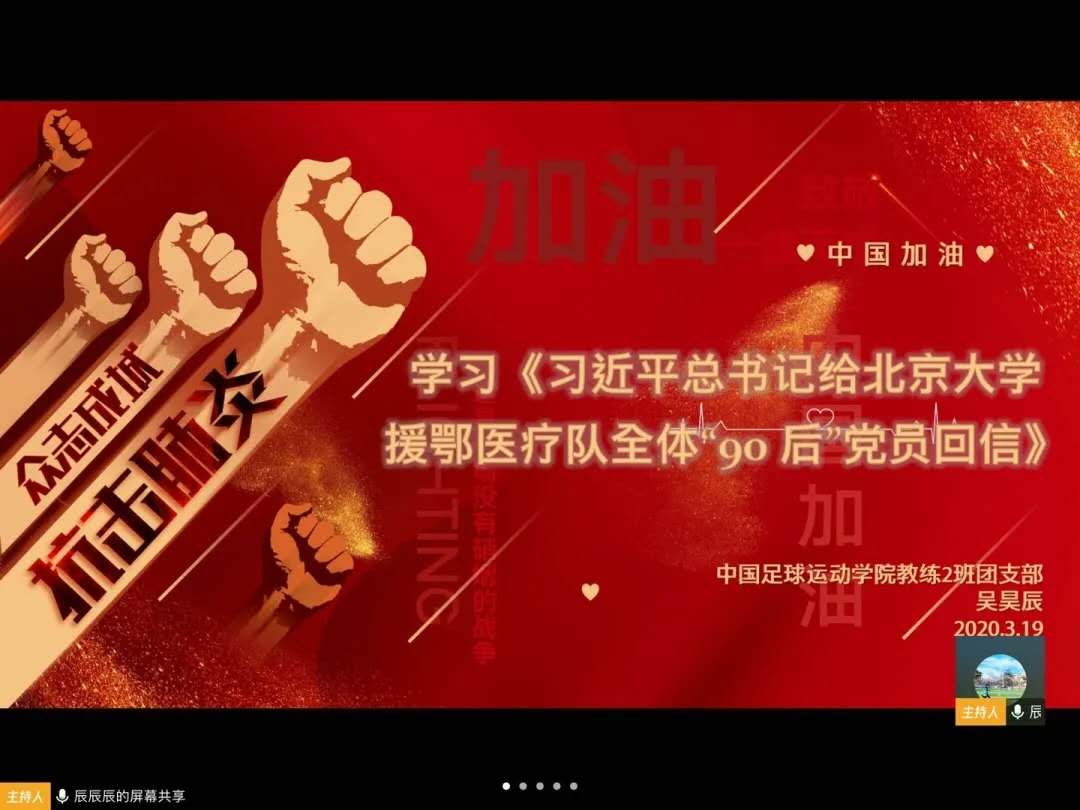 中国足球运动学院各团支部通过腾讯会议学习习近平总书记给北京大学援鄂医疗队全体“90 后”党员回信主题团日活动。