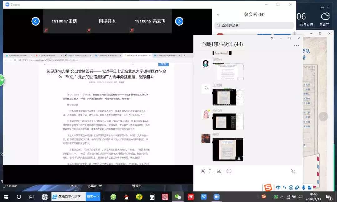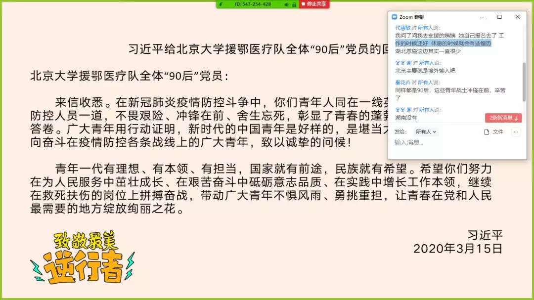 心理学院各团支部在线上开展学习习近平总书记给北京大学援鄂医疗队全体“90 后”党员回信主题团日活动。同学们在群聊中发言讨论,表达了自己对医疗队的敬仰之情。