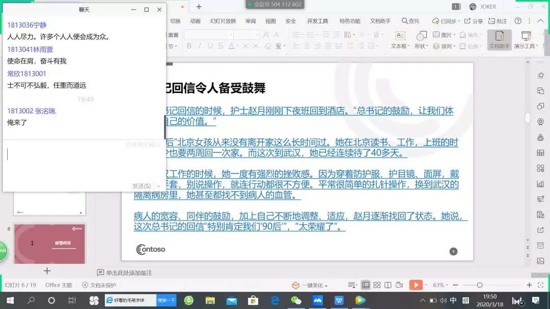 马克思主义学院各团支部在线上开展学习习近平总书记给北京大学援鄂医疗队全体“90 后”党员回信主题团日活动。同学们积极发言,浅谈自己的心得体会。