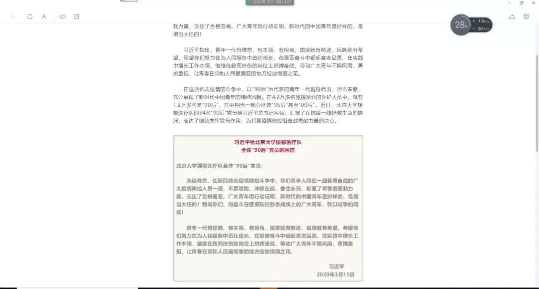 中国游泳运动学院各团支部在线上开展学习习近平总书记给北京大学援鄂医疗队全体“90 后”党员回信主题团日活动。同学们纷纷表示自己的收获匪浅,并写下心得体会。