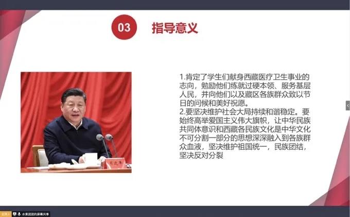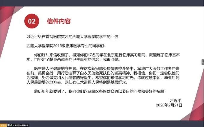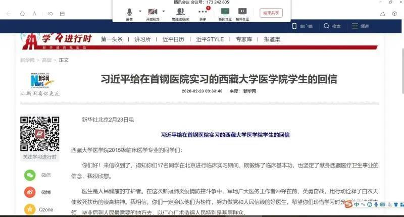 2月21日中共中央总书记、国家主席、中央军委主席习近平给正在北京大学首钢医院实习的西藏大学医学院学生回信,肯定他们献身西藏医疗卫生事业的志向,勉励他们练就过硬本领、服务基层人民,并向他们以及藏区各族群众致以节日的问候和美好的祝愿。我校375个团支部共13000余名团员青年通过视频会议的形式开展线上学习。