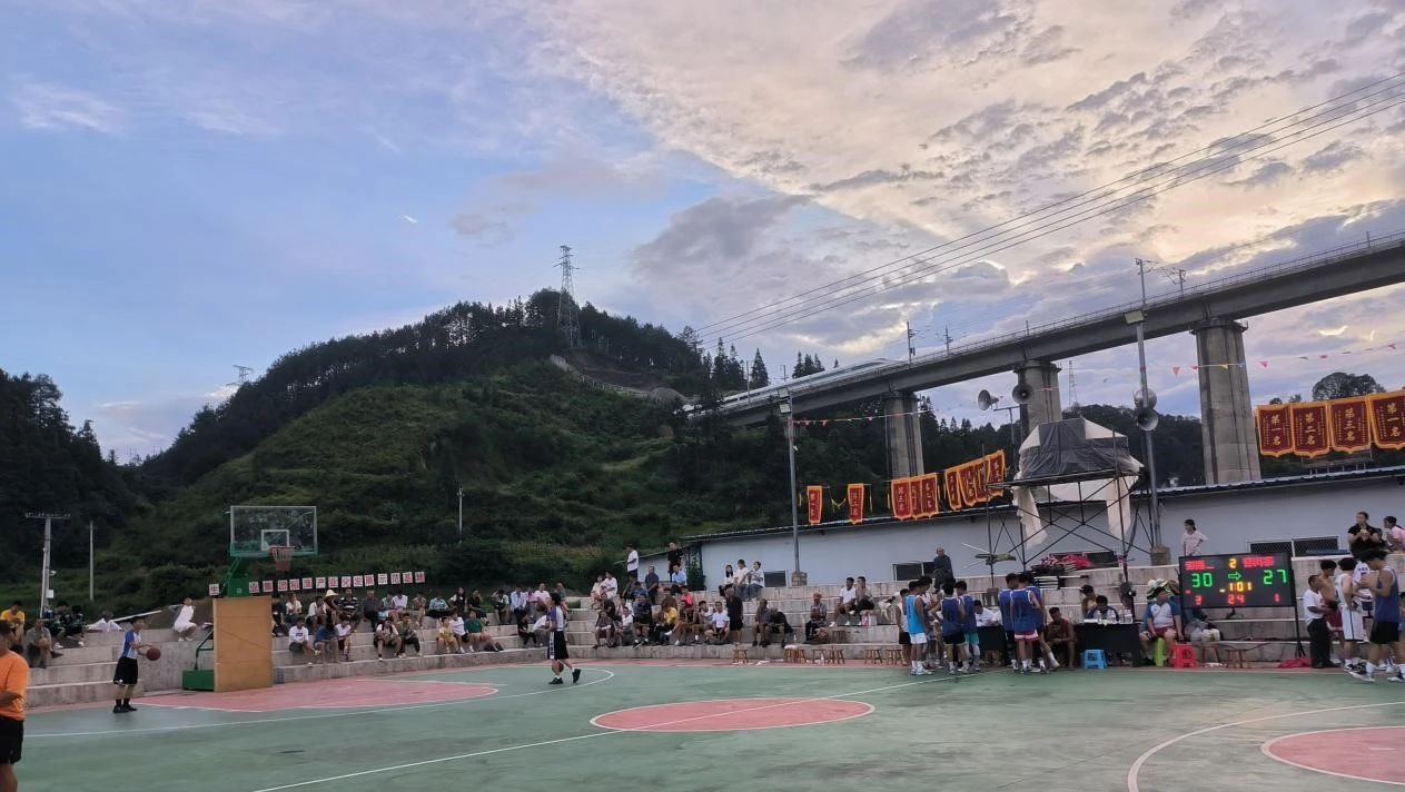 平水村村BA篮球场,后方即为高铁穿山而过