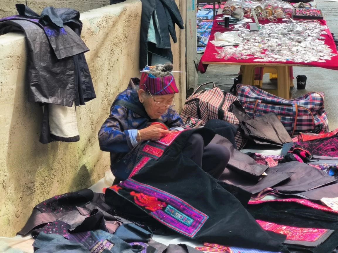 市集上老婆婆在进行民族服饰手工制作