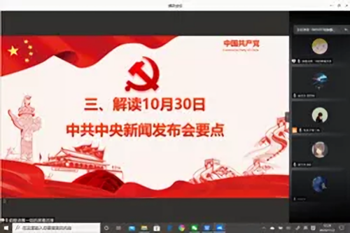 会上,张荣子首先带领同学们观看了《新闻联播》中有关十九届五中全会内容的节选。