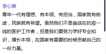 “90后”青年们的抗疫身影,对我们来说,是一种激励,这次是他们站在了我们身前,让我们通过看他们的背影学会了责任与担当。“人定胜天,静待疫情过去,迎接春花烂漫。待我们学成,与他们一起奋战新时代!”这一次的磨难与考验会让我们成长。传承,也在悄然发生。