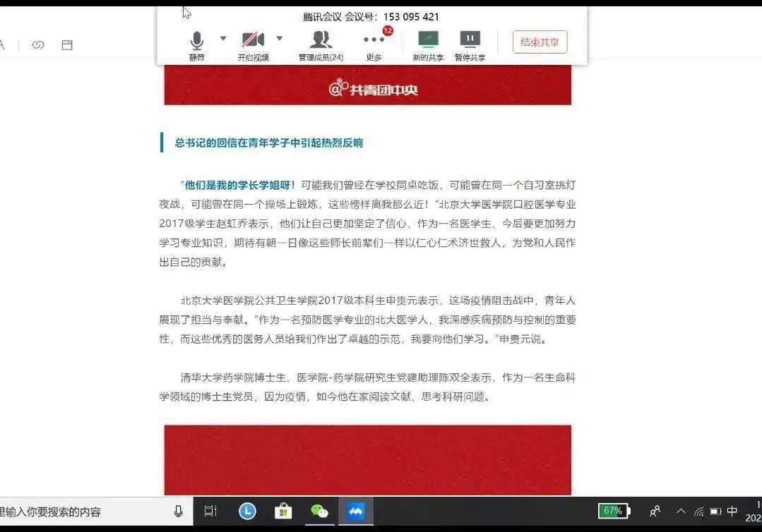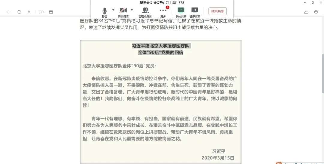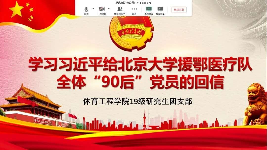 体育工程学院研究生2019级团支部学习习近平总书记给北京大学援鄂医疗队全体“90 后”党员回信,并以线上会议的形式畅谈各自的感想。