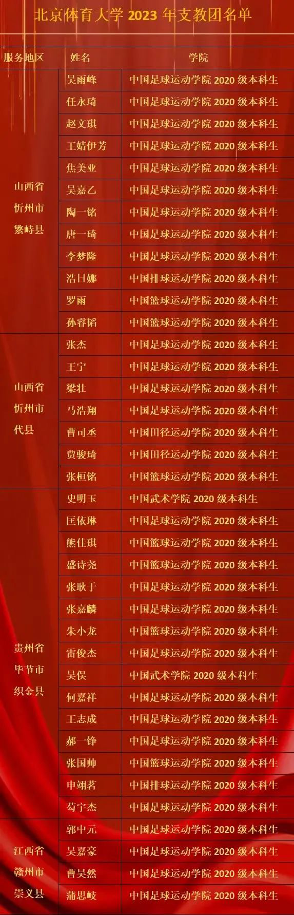 我校来自中国足球运动学院、中国田径运动学院和中国篮球运动学院的19名同学分为两组前往山西省忻州市繁峙县和代县进行支教。