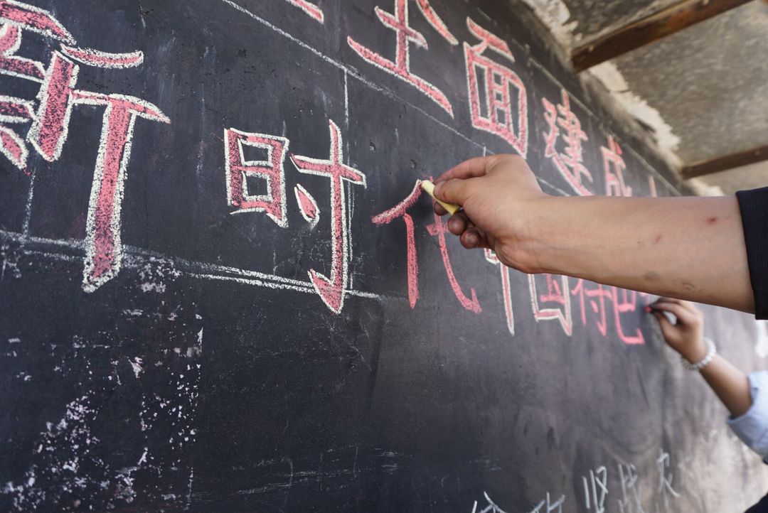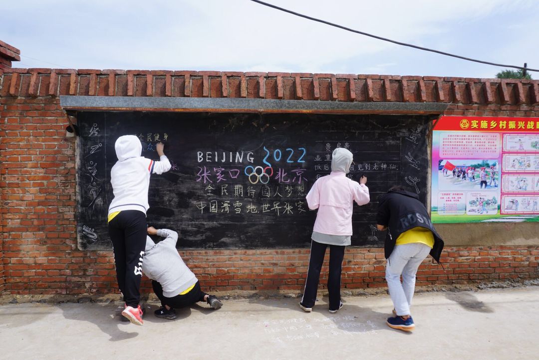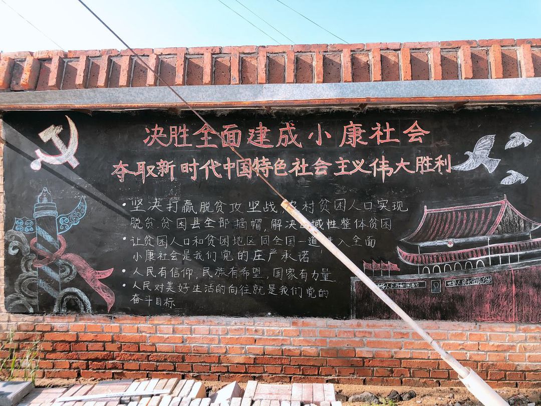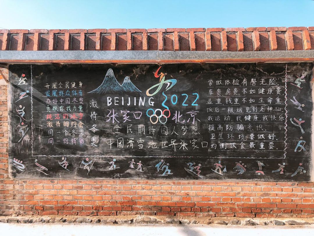为了宣讲十九大精神及冬奥知识,结合当地老年人口较多的现实,在前两日走村入户了解当地人民生活现状开展宣讲以外,我们结合该村的板报栏进行图画宣传,让每一名途经此地的村民都能认识到党和国家的最新形势,感受到党和政府对困难群众无微不至的关怀,同时结合张家口的冬奥举办契机,为当地村民带来致富的新门路。经历两个多小时的精雕细琢以后,两面活泼生动的板报墙赫然出现在我们眼前,远观此景,顿觉村貌焕然一新,令人倍感振奋,一幅幅用心的图画和一个个工整的大字更加坚定了当地村民脱贫致富的决心和意志!